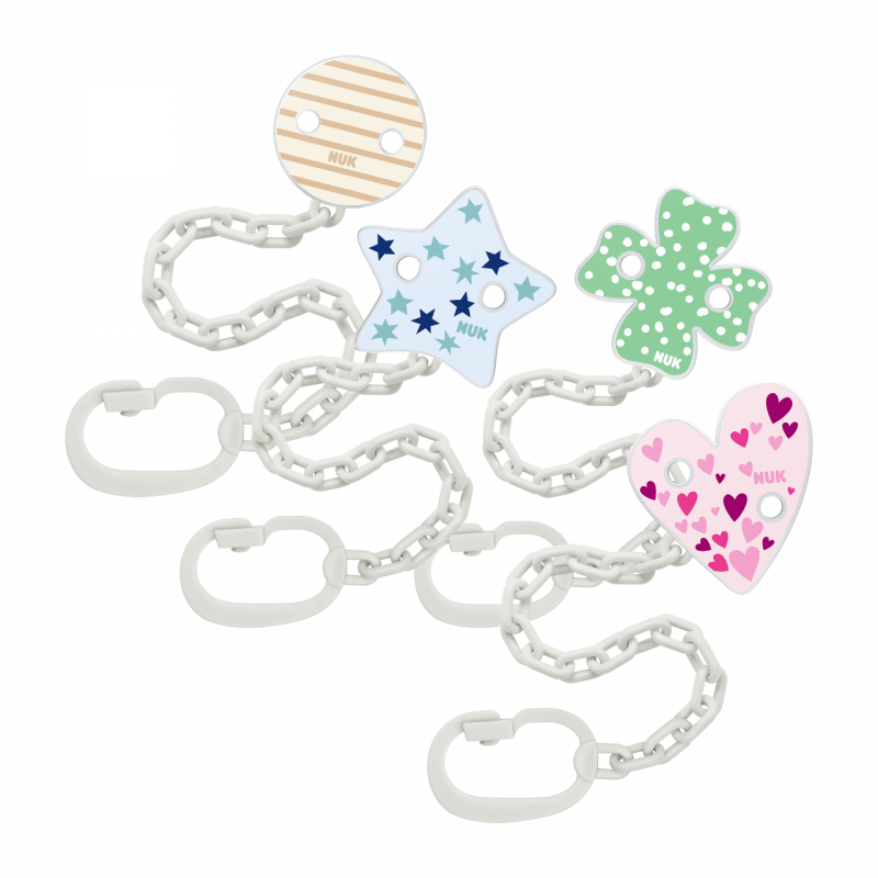 Řetízky na dudlík jsou praktické, protože zabraňují pádu dudlíku na zem a předchází jeho ztrátě. Řetízek se k dudlíku připevňuje pomocí háčku. Řetízky na dudlík NUK jsou vyrobeny z vysoce kvalitních syntetických materiálů; jsou spolehlivé, nerozbitné a dostupné v různých motivech. A díky krásnému designu jsou i pěkným doplňkem.